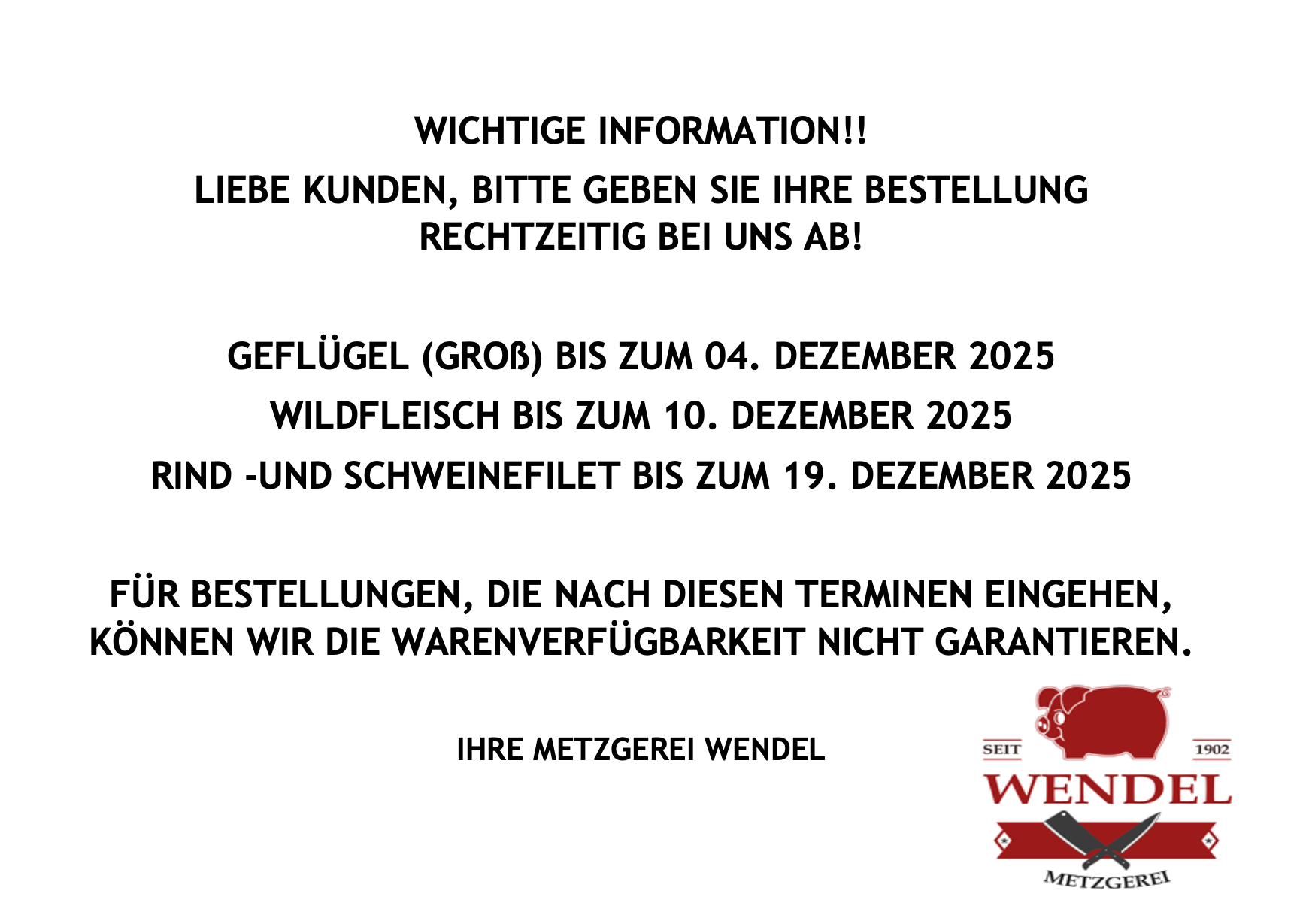 Unser freundliches und geschultes Team ist gern für Sie da und berät Sie fachkundig in unserer Metzgerei. Als besonderen Service bieten wir auch den WENDEL EXPRESS an. Sie bestellen Ihre gewünschten Artikel hier im Shop und wir liefern Ihre Bestellung zweimal die Woche innerhalb unseres Liefergebietes direkt an Ihre Haustür.